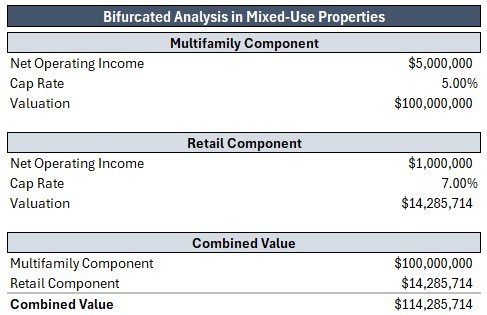 In practice, different uses within the same property, whether multifamily, retail, or office, carry different income stability, lease structures, and risk profiles. When those differences are material, a single cap rate can obscure how risk is actually distributed within the asset. This is where a bifurcated analysis becomes relevant.