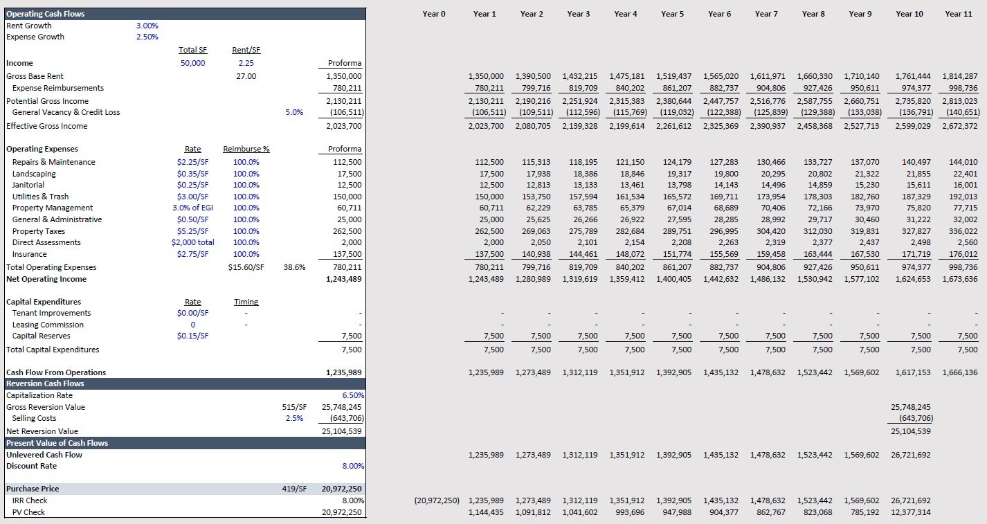 How do we determine the right purchase price for a commercial property with a targeted return in mind? By using the Discounted Cash Flow (DCF) Analysis. When using this method, the DCF model should be built out to the desired investment timeline, then we can calculate the maximum price we should pay for the property using the cash flow from operations plus the reversion value.
