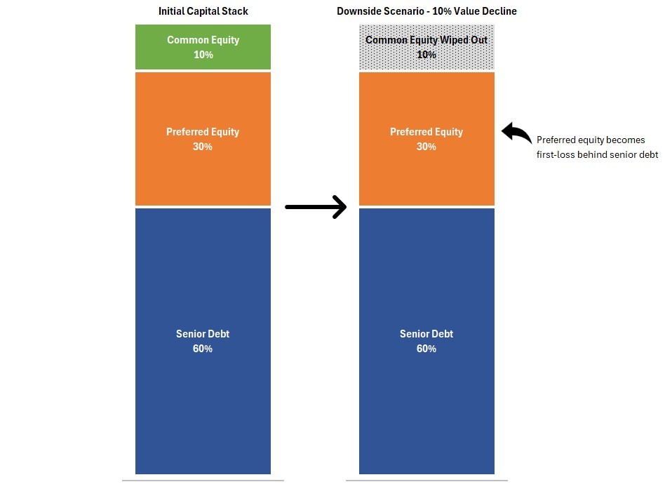 But as leverage increases, for example approaching or exceeding 90% LTV, the risk profile begins to change. In downside scenarios where common equity is wiped out, preferred equity effectively becomes first-loss beneath senior debt – meaning the risk profile can begin to resemble common equity while returns remain capped.