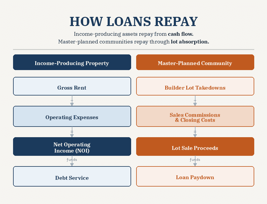 Unlike stabilized assets that generate recurring operating income, master-planned communities typically repay debt through the sale of lots to homebuilders. Because of this, the underwriting framework differs from traditional income-producing real estate.