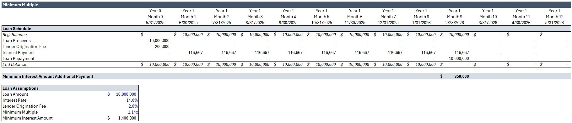 See the loan schedule below, in this example the loan is paid off early in Month 9. The monthly interest payments are $116,667 ($10,000,000 x 14%/12). The sum of these interest payments for nine months is $1,050,000. This is lower than the required minimum interest amount of $1,400,000. So, the borrower would owe $350,000 to the lender to hit their minimum return requirement – ensuring that they receive at least a 1.14x multiple on invested capital (MOIC).